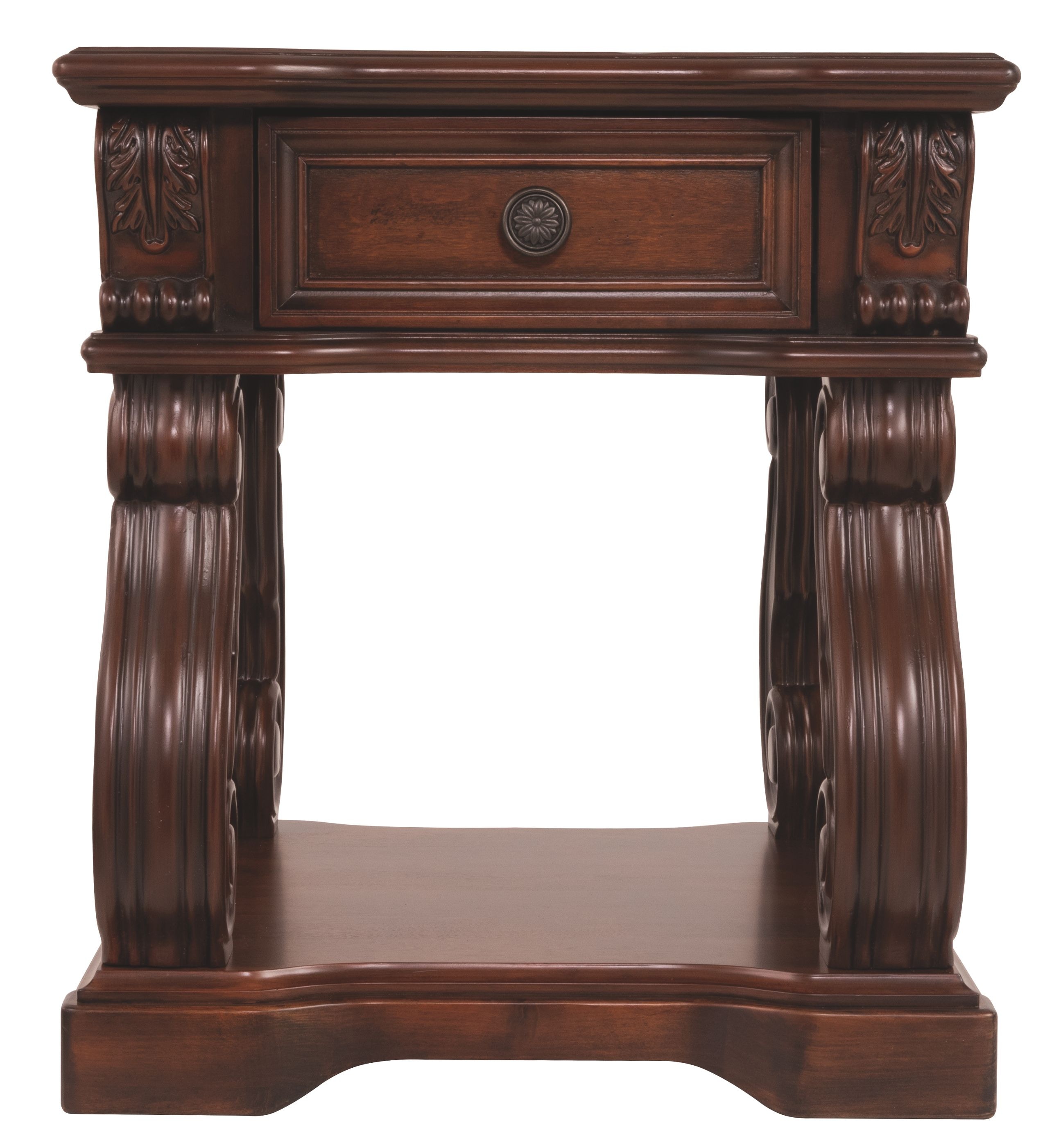 Stow odds and ends in the drawer and display your favorite whatnots on the bottom shelf. The shapeliness of Alymere end tables serpentine legs is beautifully contrasted by a linear tabletop. Serpentine legs ornate detailing and practicality come together beautifully in the Signature Design By Ashley Alymere Brown Square End Table.